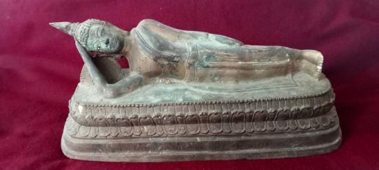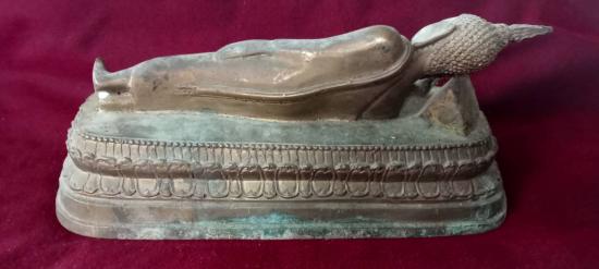 พระบูชา ปางไสยาสน์ ขนาดฐานเหลี่ยมประมาณ 10 นิ้ว 3 หุน X เกือบ 4 นิ้ว ประทับนอนบนบังลังก์บัวคว่ำบัวหงาย สลักชื่อผู้สร้าง และ วันเดือนปีที่สร้าง 22 มกราคม 2547 เนื้อทองเหลืองเก่าคร่ำ เกิดสนิมหยกที่พระพักตร์ และประปรายทั่วองค์พระ ผิวหิ้ง ตามุก ใต้ฐานมองเห็นแกนลวดหุ่นพระ ศิลป์สวย สภาพสวยตามรูป ส่งฟรีทั่วไทย รับประกันตามกฎครับ