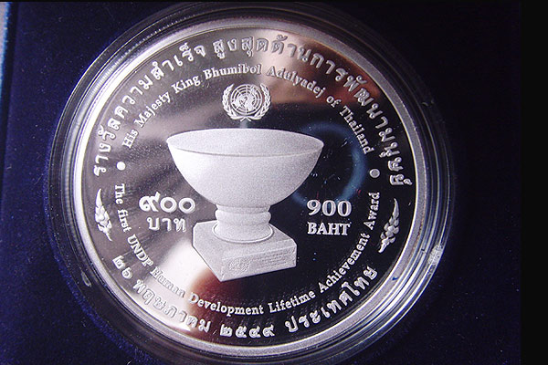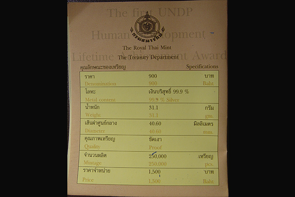 เหรียญรางวัลความสำเร็จสูงสุดด้านการพัฒนามนุษย์ ปี 2549 เนื้อเงินบริสุทธิ์ 99.9% กล่องใบเดิมๆ เป็นเหรียญกษาปณ์ชนิดราคา 900 บาท ในหลวงรัชกาลที่ 9 หนัก 31.1 กรัม ถ่ายทั้งตลับเดิม