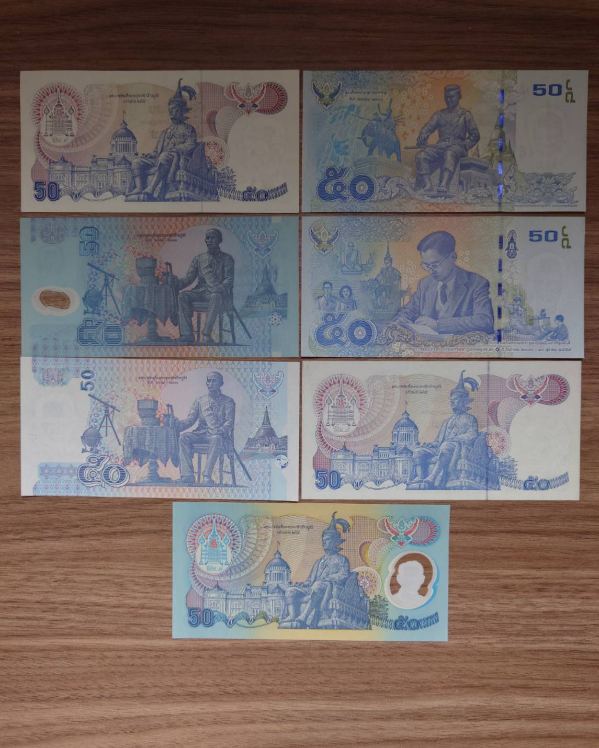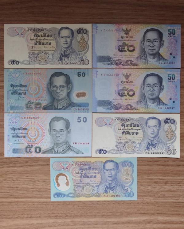 ชุดธนบัตร50บาท ในยุคสมัยรัชกาลที่9 จำนวน7ใบ 7แบบ สภาพไม่ผ่านการใช้งาน