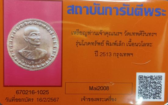 เหรียญท่านเจ้าคุณนรฯ วัดเทพศิรินทรฯ รุ่นโภคทรัพย์ พิมพ์เล็ก(ตาสองชั้นนิยม) เนื้อนวโลหะ ปี2513 จ.กรุงเทพฯ พร้อมบัตรรับรอง