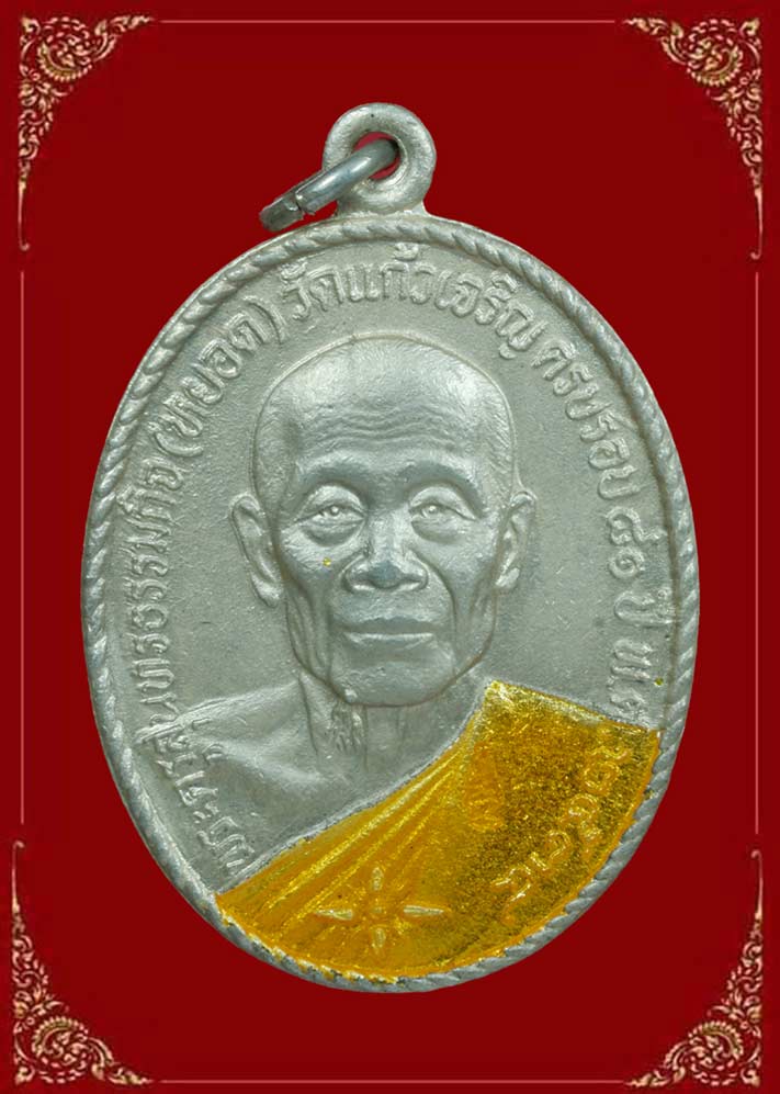วัดใจ...เหรียญหลวงพ่อหยอด วัดแก้วเจริญ จ.สมุทรสงคราม รุ่นทรัพย์ล้นเหลือ เนื้อเงินลงยาสีเหลือง ปี2534 ตอกโค๊ต หายาก สภาพสวย กล่องกำมะหยี่เดิมๆครับ.
