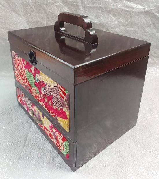 กล่องไม้โบราณสไตล์ญี่ปุ่น ทำจากไม้เคลือบเงา ตกแต่งด้วยผ้าทอกิโมโน 1 ลิ้นชัก