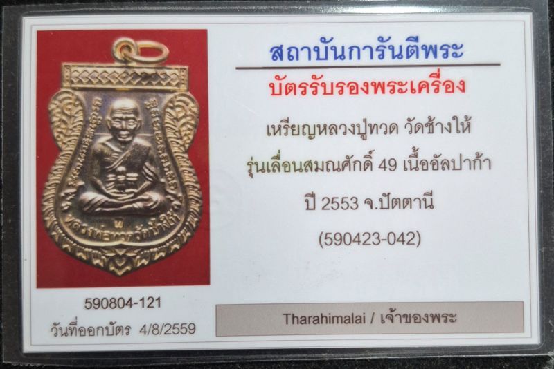 เหรียญเสมาหลวงปู่ทวด รุ่นเลื่อนสมณศักดิ์ 49 เนื้ออัลปาก้า ปี 53 พร้อมบัตรรับรอง