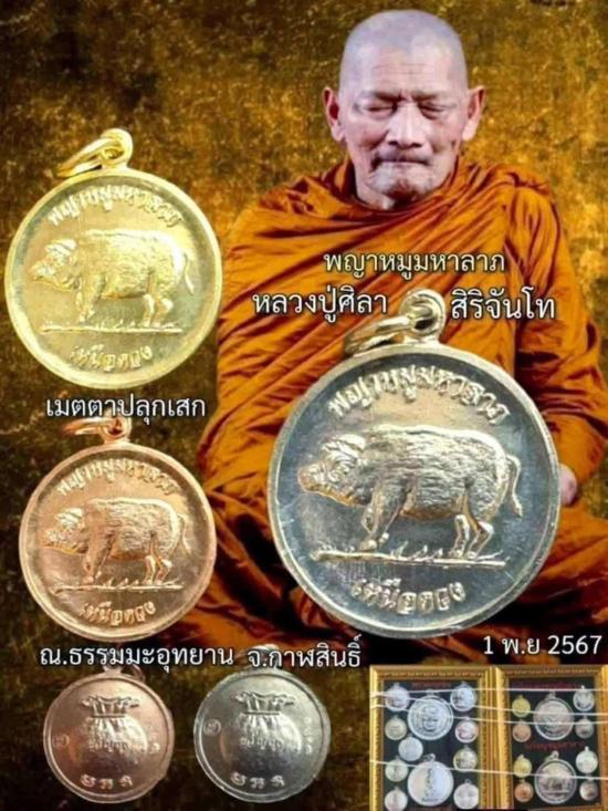 หลวงปู่มหาศิลา สิริจันโท ธรรมอุทยาน จ.กาฬสินธุ์ พญาหมูมหาลาภ รุ่น เหนือดวง หลังยันต์ขวัญถุง เนื้ออัลปาก้า