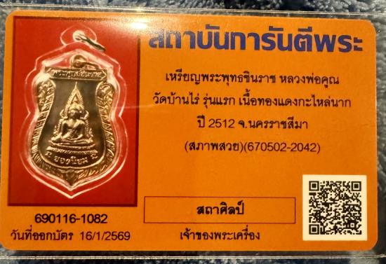 บัตรสภาพสวย เหรียญพระพุทธชินราช วัดบ้านไร่ รุ่นแรก เนื้อทองแดงกะไหล่นาก ปี2512 สวยมากๆ