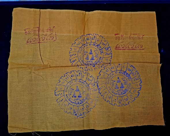 ผ้ายันต์รัตนจักร หลวงปู่ชื้น วัดญาณเสน ยันต์ 3 ดวง มีจาร ปั๊มตรากำกับ กว้าง 10.5 นิ้ว ยาว 13 นิ้ว สร้างน้อย |