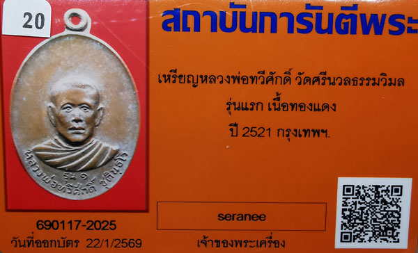เหรียญหลวงพ่อทวีศักดิ์(เสือดำ)วัดศรีนวลธรรมวิมล รุ่นแรก เนื้อทองแดง ปี2521 จ.กทม. + บัตรG-pra สภาพเดิมค่ะ |