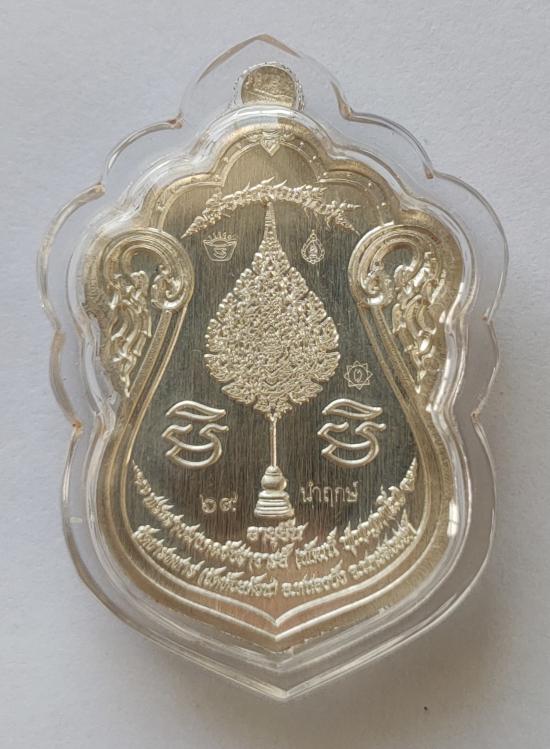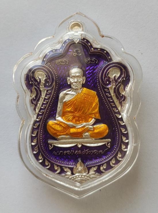 เหรียญเลื่อนสมณศักดิ์ หลวงพ่อพัฒน์ เนื้อเงินลงยาม่วง ชุดนำฤกษ์ เลี่ยมพลาสติก