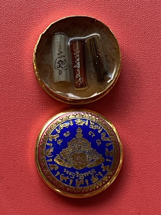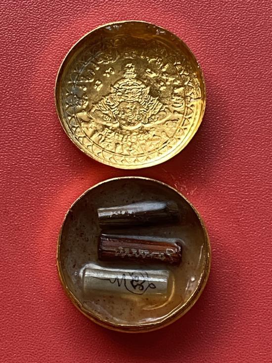 เคาะเดียวแดง สีผึ้งพระราหู รุ่น มงคลจักรวาล เนื้อ โลหะชุบทองลงยาสีน้ำเงิน ขอบสีแดง ขนาด3.2ซม |