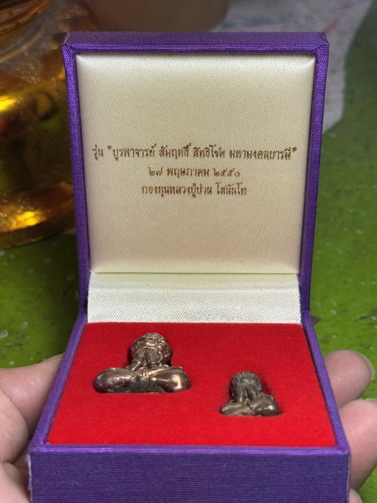 ปิดตาพังพะกาฬ เนื้อทองผสม ชนวนคันฉ่องสุริยัน-จันทรา รุ่น บูรพาจารย์ สัมฤทธิ์ สิทธิโชค มหามงคลบารมี ครับ เป็นของ กองทุนหลวงพ่อปาน โสนันโท พ.ศ. 2550 มาเป็นคู่ |