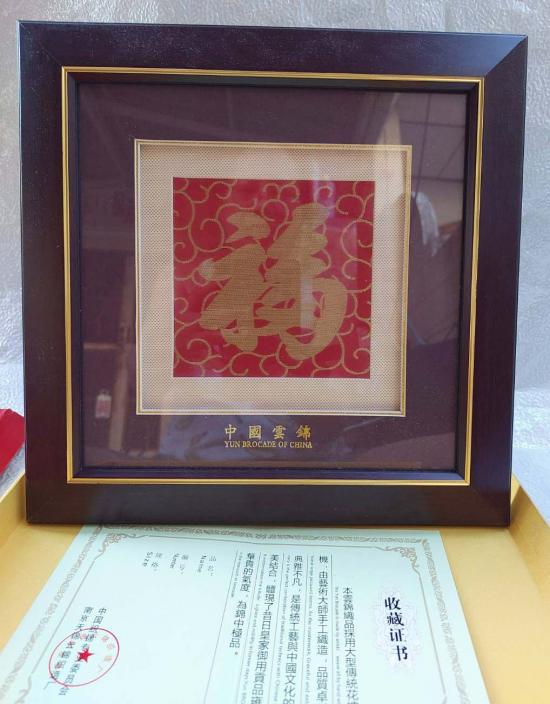 กรอบรูปผ้าไหมจีนหนานจิงที่เรียกว่า "หยุนจิน" (Yunjin) หรือผ้าทอเมฆ ซึ่งเป็นงานหัตถกรรมแบบดั้งเดิมของจีนที่มีชื่อเสียงในด้านฝีมืออันประณีตและมีความสำคัญทางวัฒนธรรม