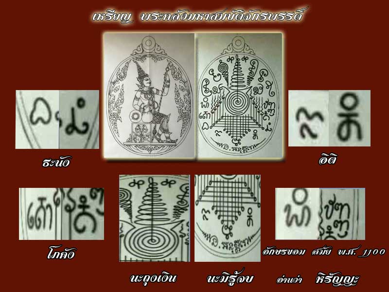 และยังใส่อักษรขอมสมัยโบราณ คำว่า หิรัญญะ, โภคัง, ธะนัง, และ อิติ ซึ่งมีความหมายเกี่ยวกับด้านทรัพย์สิน เงินทอง