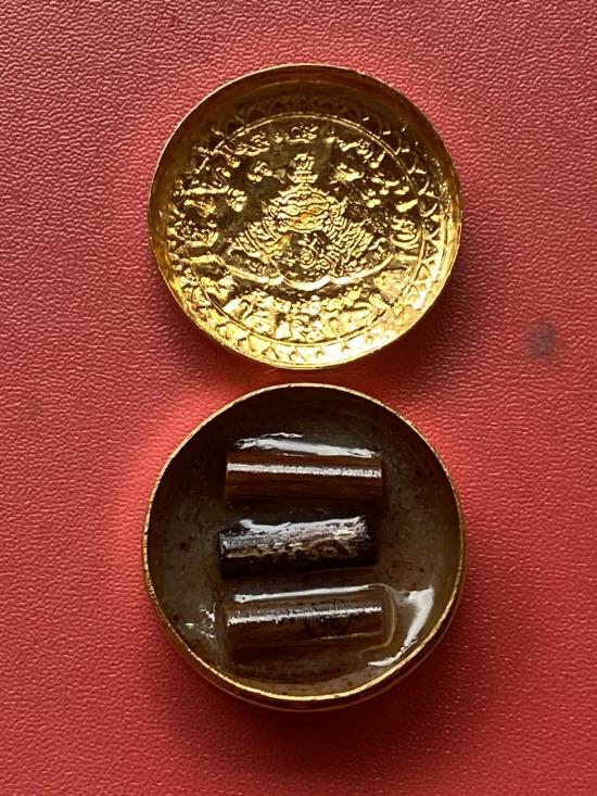 เคาะเดียวแดง สีผึ้งพระราหู รุ่น มงคลจักรวาล เนื้อ โลหะชุบทองลงยาสีดำขอบสีแดง ขนาด 3.2ซม |