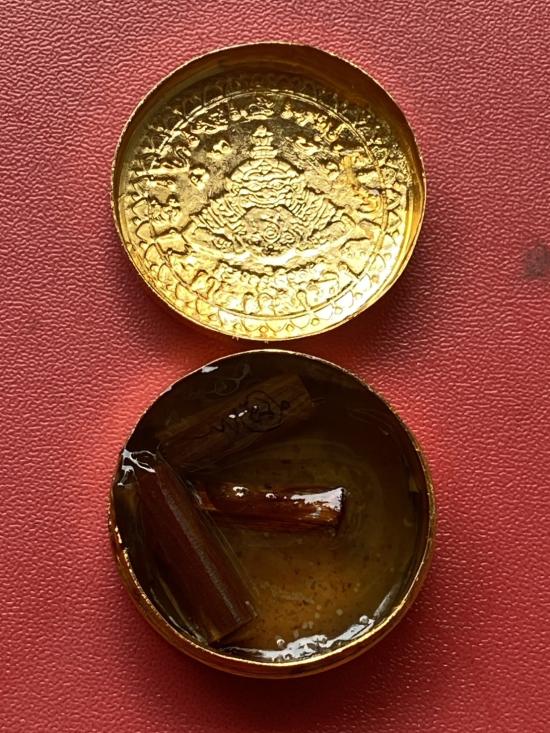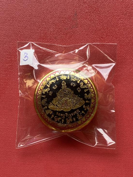 เคาะเดียวแดง สีผึ้งพระราหู รุ่น มงคลจักรวาล เนื้อ โลหะชุบทองลงยาสีดำขอบสีแดง ขนาด 3.2ซม |