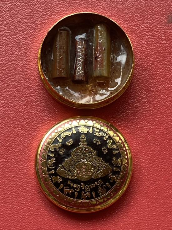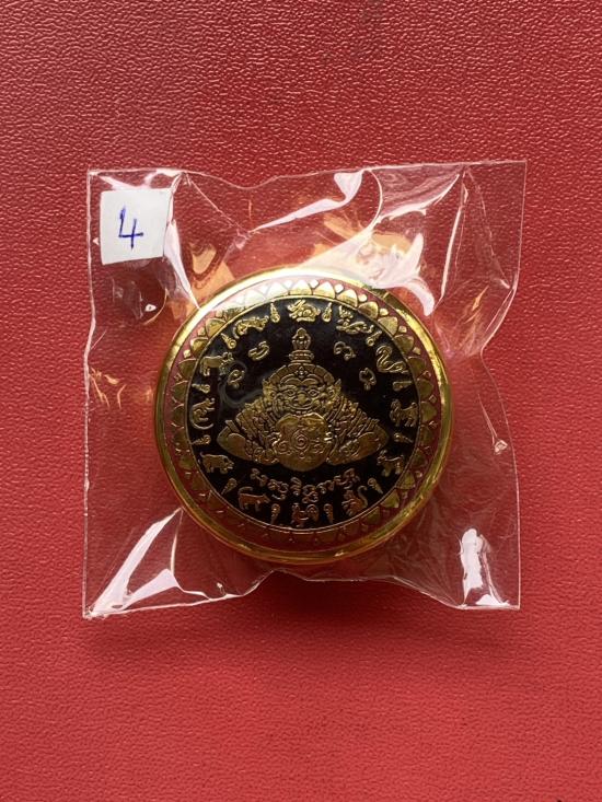 เคาะเดียวแดง สีผึ้งพระราหู รุ่น มงคลจักรวาล เนื้อ โลหะชุบทองลงยาสีดำขอบสีแดง ขนาด 3.2ซม แดง 100 |