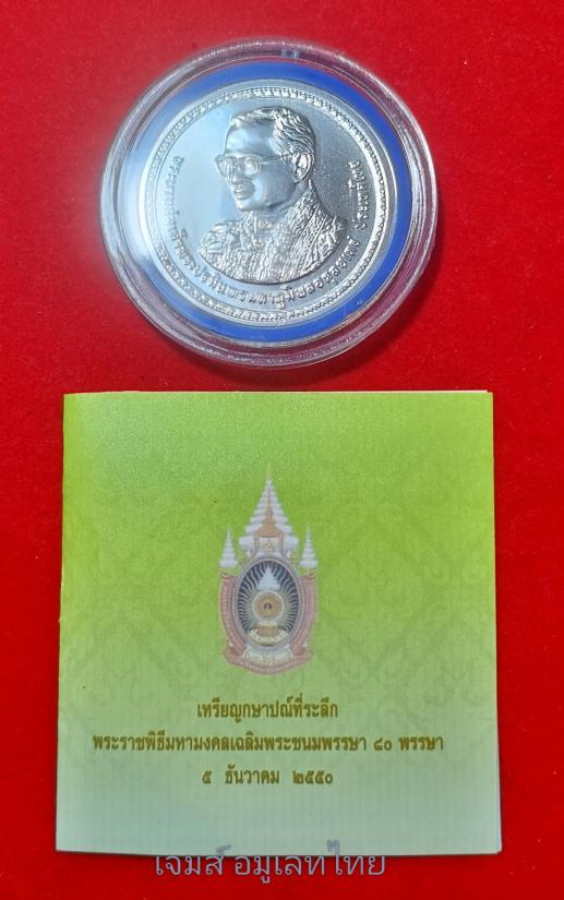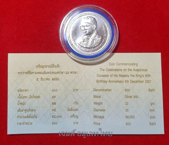 เหรียญเนื้อเงิน ที่ระลึก 800 บาท เนื้อเงิน บริสุทธิ์ 99% น้ำหนัก 22 กรัม พระราชพิธีมหามงคลเฉลิมพระชนมพรรษา 80 พรรษา 5 ธันวาคม 2550 พร้อมใบเซอร์ ตลับและซองพลาสติก ไม่ผ่านการใช้งาน รับประกันตามกฏ