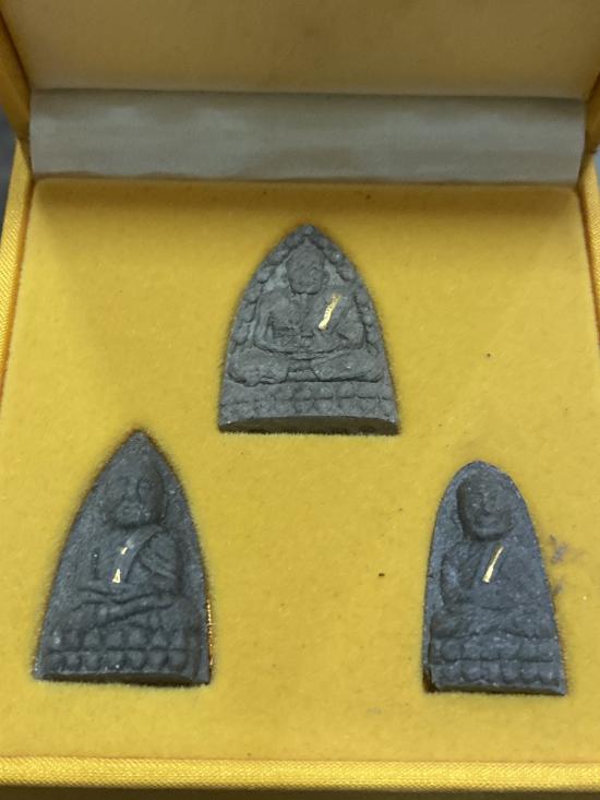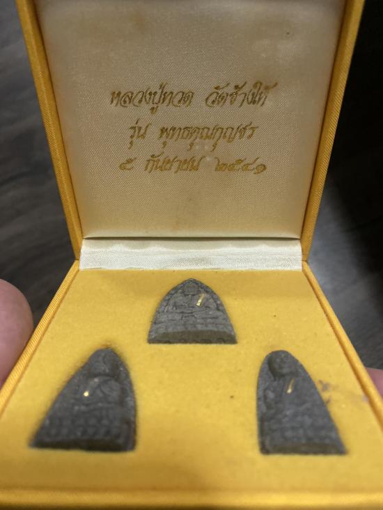ชุดหลวงปู่ทวด รุ่นพุทธคุณกุญชร เนื้อว่านผสมงาช้างแมมมอธ (ฝังตะกรุดทองคำ) อยู่ในซีลเดิม ปี 2541 อาจารย์นองปลุกเสก พร้อมกล่องเดิม |