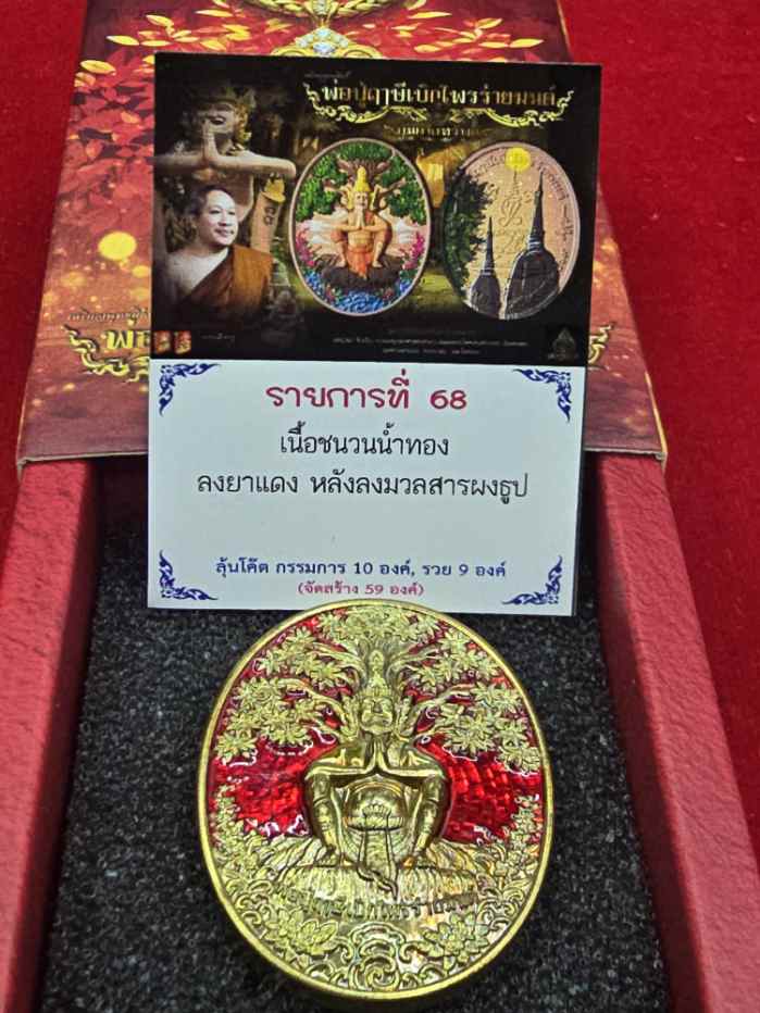 เหรียญพ่อปู่ฤาษีเบิกไพรร่ายมนต์ พระอาจารย์เลี้ยง วัดจอมเกษ เนื้อชนวนน้ำทองลงยาแดง หลังลงมวลสารผงธูป เลข38 |