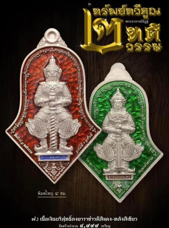 เหรียญท้าวเวสสุวรรณ หน้ายักษ์ อีกด้านหน้าเทพ รุ่นทรัพย์ทวีคูณ 2 ทศวรรษ จำปี 45 เนื้อเงินบริสุทธิ์ลงยาราชาวดี หน้าสีแดง -หลังสีเขียว จัดสร้างโดย หลวงพ่ออิฏฐ์ วัดจุฬามณี |