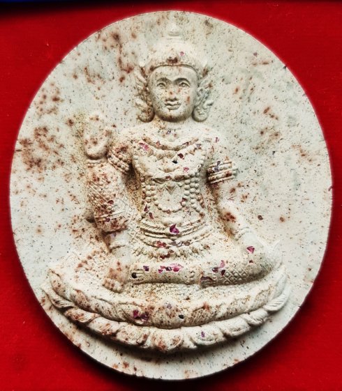ลักษณะเป็นรูปทรงกลมขนาด 5 ซม. กึ่งกลางเป็นองค์พระพุทธเจ้าประทับนั่งปางมารวิชัยบนฐานบัวในซุ้มเรือนแก้วด้านข้างซ้ายขวาเป็นรูปสถูปเจดีย์ ด้านหลังกึ่งกลางเป็นพระพิมพ์ซุ้มประตูกรุวัดนางตรา