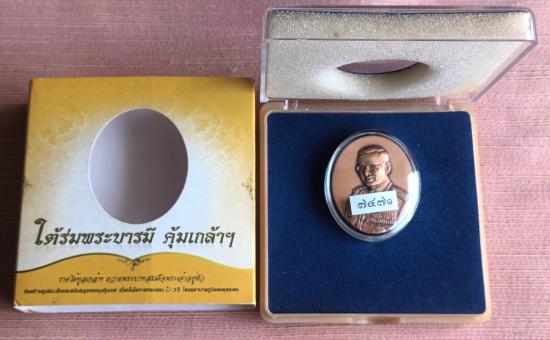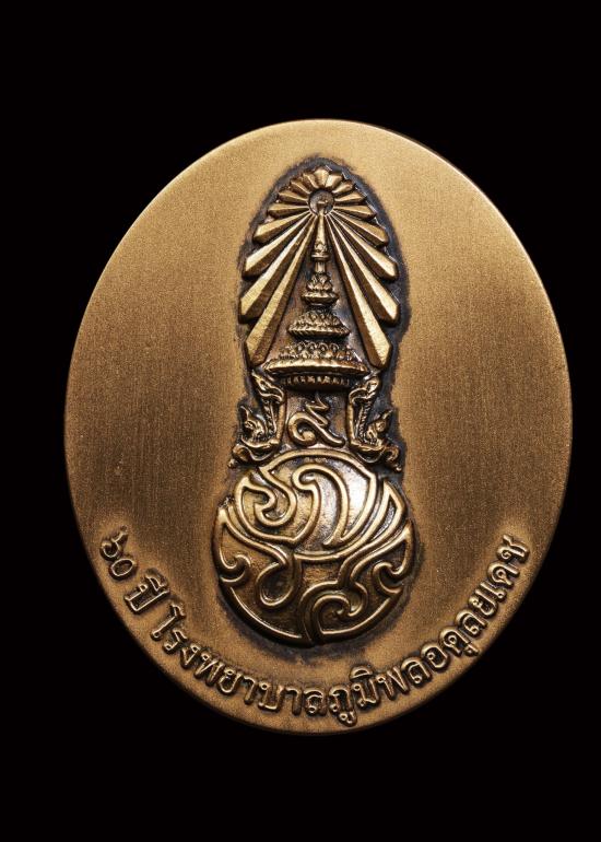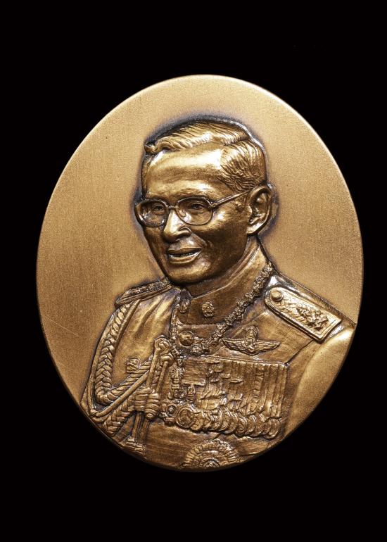 รูปหล่อประติมากรรม ในหลวงร.9 ใต้ร่มพระบารมี คุ้มเกล้าฯ 60ปี โรงพยาบาลภูมิพลฯ ((( เนื้อทองแดง ))) 34*28 มม. ไม่ผ่านใช้ สวยเดิม กล่องเดิม