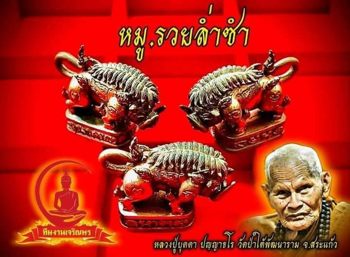 พญาหมูพลิกชะตา รุ่นรวยร่ำซำ หลวงปู่บุดดา วัดป่าใต้พัฒนาราม จ.สระแก้ว. รุ่นรวยล่ำซำ เนื้อชุบทองอุดผงมวลสารฝังตะกรุดเงิน 1 ดอก จำนวนสร้างน้อย มีเพียง 147 องค์เท่านั้น น่าบูชาสุดๆ สวยมาก อนาคตต่อไปจะเป็นพระหลักของหลวงปู่บุดดาแน่นอนครับ ราคายังเบาๆอยู่ครับ เก็บได้รีบเก็บครับ พระหลวงปู่บุดดามีประสบการณ์มากกับผู้ที่แขวนบูชา อนาคตจะเป็นพระหลักของเมืองสระแก้วและภาคตะวันออกแน่นอนครับ โอกาสเป้นของผู้ที่มองเห็นเสมอ รับประกันชั้นหนึ่งครับ |