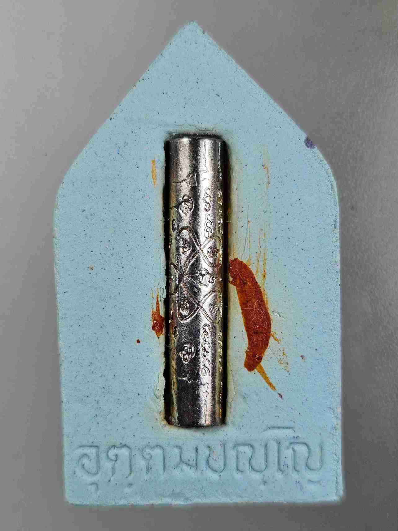 ตะกรุดที่ฝังด้านหลังเป็นยันต์จักรพรรดิ์ที่หลวงพ่อจารแล้วนำไปหลอม เพื่อสร้างองค์เหมือนพระพุทธชินราช แผ่นยันต์ของหลวงพ่อไม่ละลาย จึงนำรูปแบบยันต์มาสร้างเป็นตะกรุด |