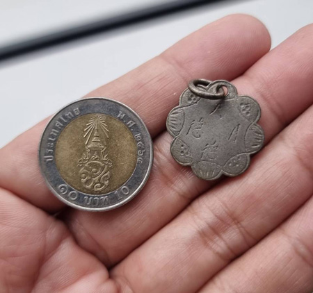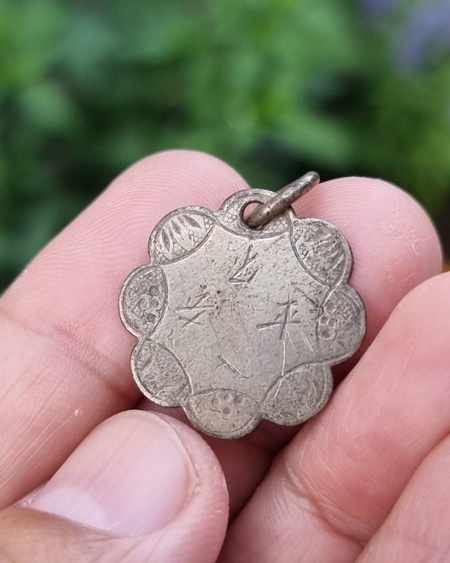 No.2 เหรียญจีน ดอกเหมย อักษรจีนอยู่ตรงกลาง เนื้อเงิน ห่วงเชื่อม ของจีนโบราณ หรือเหรียญหยินหยาง ซึ่งเป็นเครื่องรางจีนโบราณที่นิยมใช้เพื่อเสริมสิริมงคล