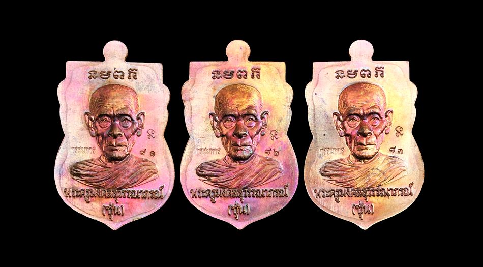 +!!เคาะเดียวllดง ตลอดสาย!!+ (รับ 3 เหรียญ) เสมาหัวโต หลวงปู่ทวด-พ่อท่านซุ่น วัดบ้านลานควาย จ.ปัตตานี รุ่นมงคล88 ปี2558 เนื้อทองแดงผิวรุ้ง เลขเรียงติดกัน เลขสวย 81/82/83 พร้อมกล่องครับ