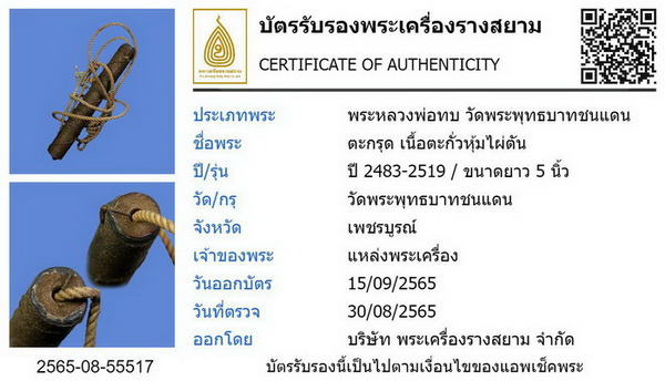 ตะกรุดเนื้อตะกั่วหุ้มไผ่ตัน หลวงพ่อทบ วัดพระพุทธบาทชนแดน ปี 2483-2519 ขนาด 5 นิ้ว |