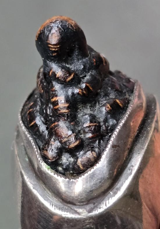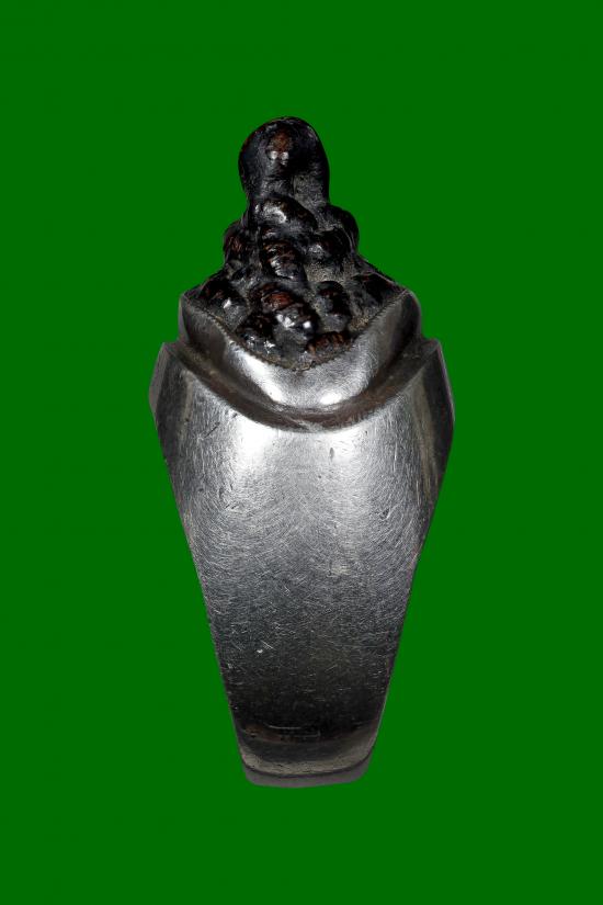 ท้องแหวนขาดไปเจ้าของทำเป็นตัวเรือนเงินมา และ ใส่งากระเด็นอุดใต้ท้องแหวนมาให้ด้วย ขนาดประมาณแหวนเบอร์ 60 หรือเส้นผ่านศูนย์กลางประมาณ 1.5 ซ.ม.