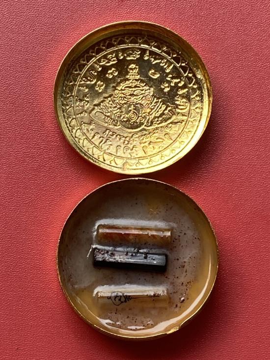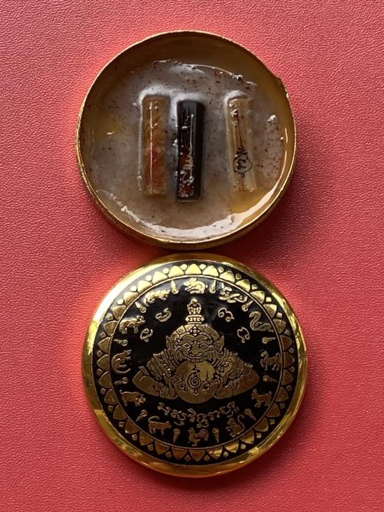 เคาะเดียวแดง สีผึ้งพระราหู รุ่น มงคลจักรวาล เนื้อ โลหะชุบทองลงยาสีดำขอบสีดำ ขนาด 5ซม