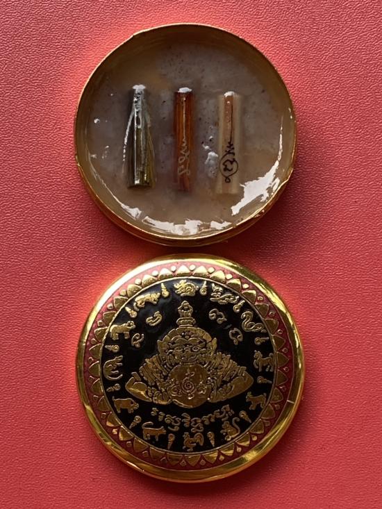 เคาะเดียวแดง สีผึ้งพระราหู รุ่น มงคลจักรวาล เนื้อ โลหะชุบทองลงยาสีดำขอบสีแดง ขนาด 5ซม