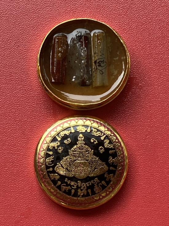เคาะเดียวแดง สีผึ้งพระราหู รุ่น มงคลจักรวาล เนื้อ โลหะชุบทองลงยาสีดำขอบสีแดง ขนาด 3.2ซม