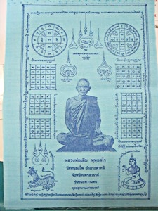 ๑๐๙-ผ้ายันต์ ลพ.เดิม วัดหนองโพธิ์ นครสวรรค์ รุ่นชนะความจนปี๕๓ สีฟ้าขนาด ๖x๘.๕นิ้ว |