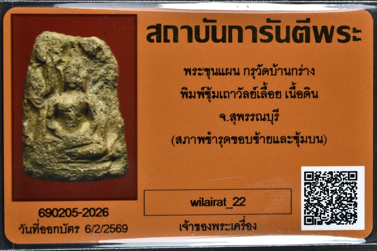 พระขุนแผนซุ้มเถาวัลย์เลื้อย กรุบ้านกร่าง พร้อมบัตรรับรอง "หายาก"