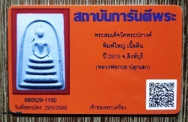 พระสมเด็จ พิมพ์ใหญ่ วัดพระปรางค์ เนื้อดิน ปี 2515 จังหวัดสิงห์บุรี ( หลวงพ่อกวย,หลวงพ่อจวน, หลวงพ่อแพ และอีกหลายคณาจารย์ร่วมปลุกเสก ) พร้อมบัตรรับรอง