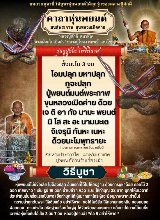 หลวงปู่ ท่านบอก ให้พกไป ใหญ่คับที่ คนเกรงใจ ไปไหนผ่านสะดวก มีชัย มีกำไลตลอดทาง ลูกหลานเอ่ย บูชาไว้เทิด หุ่นพ์ยฺนต์หลวงปู่สร้างให้ใช้ ไม่มีพิษ ไม่มีภัยต่อคนบูชา ไว้คุ้มครองตน ครอบครัว รถยนต์ บ้านเรือน.. |