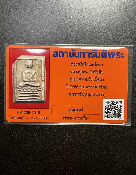 พระศรีอริยเมตไตรย เป็นพิมพ์ที่นิยมและหายากมากในชุดพระผงมฤคทายวันของหลวงปู่นาค วัดหัวหิน นานๆจะเจอสักองค์ ด้านหลังเป็นยันต์ดวงฤกษ์สร้างพระราชนิเวศน์มฤคทายวัน เป็นพระเนื้อผงน้ำมันสีขาวขุ่น ที่เรียกว่า "เนื้อกระดูก" ซึ่งเป็นเนื้อนิยมสูงสุด สภาพพระไม่ผ่านการบูชา เดิมๆ มีรอยกะเทาะนิดหน่อยตามรูป โดยรวมแล้วเป็นพระที่สวย และราคาจับต้องได้ พุทธคุณเหมือนเดิมค่ะ