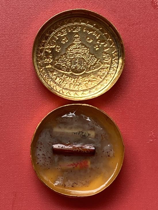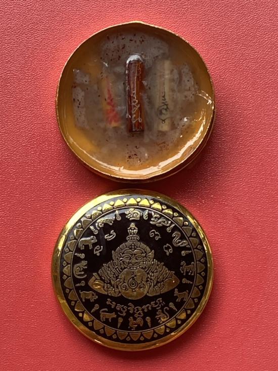 เคาะเดียวแดง สีผึ้งพระราหู รุ่น มงคลจักรวาล เนื้อ โลหะชุบทองลงยาสีดำขอบสีดำ ขนาด 5ซม
