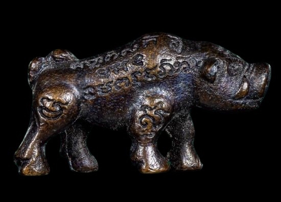 พญาหมู หลวงพ่อเส็ง รุ่นแรก พิมพ์เล็ก เนื้อตะกั่วอาบทองแดง ปี 2521 วัดบางนา จังหวัดปทุมธานี |
