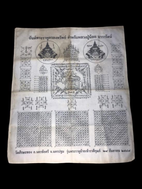 ผ้ายันต์..พระราหูครองทรัพย์ ตำรา .. หลวงพ่อน้อย วัดศรีษะทอง ต.ศรีษะทอง อ.นครชัยศรี ผืนใหญ่ ปี2549 |