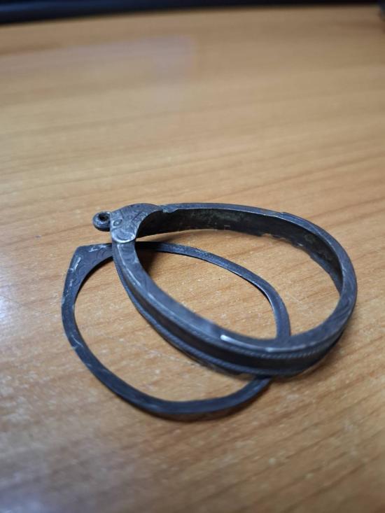 กรอบเงินเก่า ยกซุ้ม ขอบเกลียว เคยใส่ปิดตาจัมโบ้ ขอบใน กว้างสุด 3.4 cm. สูง 4 cm. |