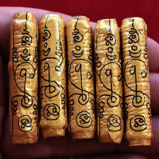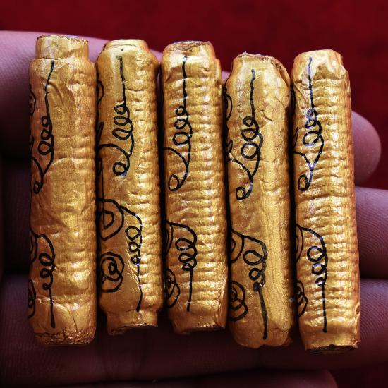 ชุด 5 ดอก...ตะกรุดกาคาบทรัพย์ ปี 2554 หลวงปู่น้อย วัดบ่อหลวง จ.เพชรบุรี พร้อมซองเดิมจากวัด สภาพพระตามรูปทุกประการ ( ทาทองจารยันต์ ขนาดยาว 2 นิ้ว )
