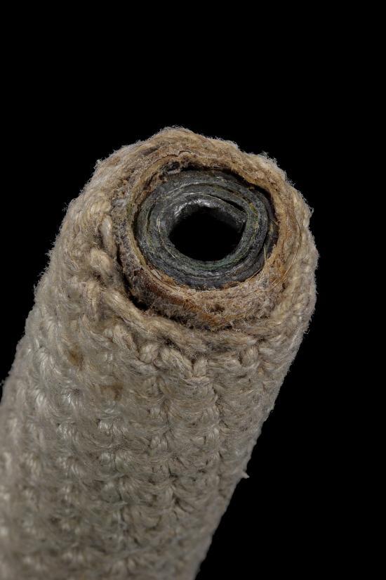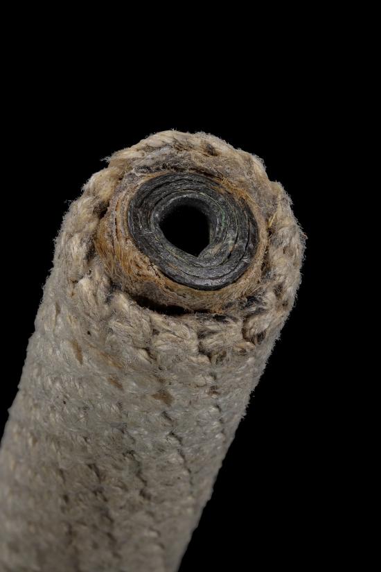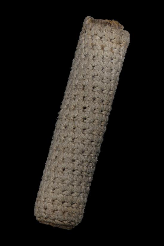ไม่แพง เคาะเดียว ตะกรุดเนื้อตะกั่ว หุ้มด้วยหนังหน้าผากเสือ แล้วถักเชือกลายชานหมาก ยาว 3 นิ้ว 6 หุน ไม่ทราบที่ ไม่ทราบเกจิครับ |