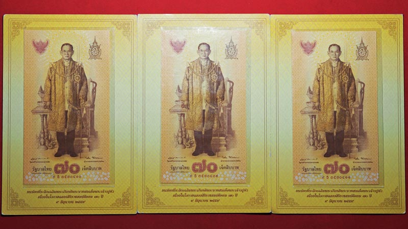 ***ชุด 3 ใบ***นบัตรที่ระลึก 70 บาท พระบาทสมเด็จพระเจ้าอยู่หัวรัชกาลที่ 9 ฉลองสิริราชสมบัติครบ 70 พร้อมซองเดิม เลขเรียง*** |