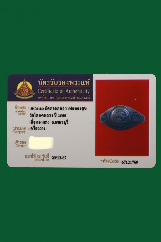 แหวนนะปัดตลอดหลวงพ่อทองศุข วัดโตนดหลวง จ.เพชรบุรี เนื้อทองแดง สร้างปี 2490-2500 (บัตรรับรองนิตยสารพระท่าพระจันทน์) |