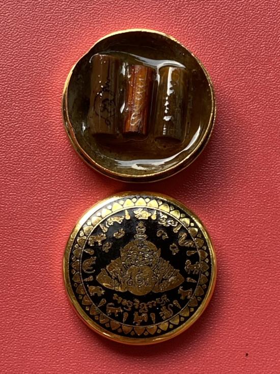 เคาะเดียวแดง สีผึ้งพระราหู รุ่น มงคลจักรวาล เนื้อ โลหะชุบทองลงยาสีดำขอบสีดำ ขนาด 3.2ซม |