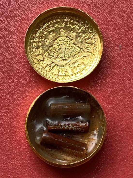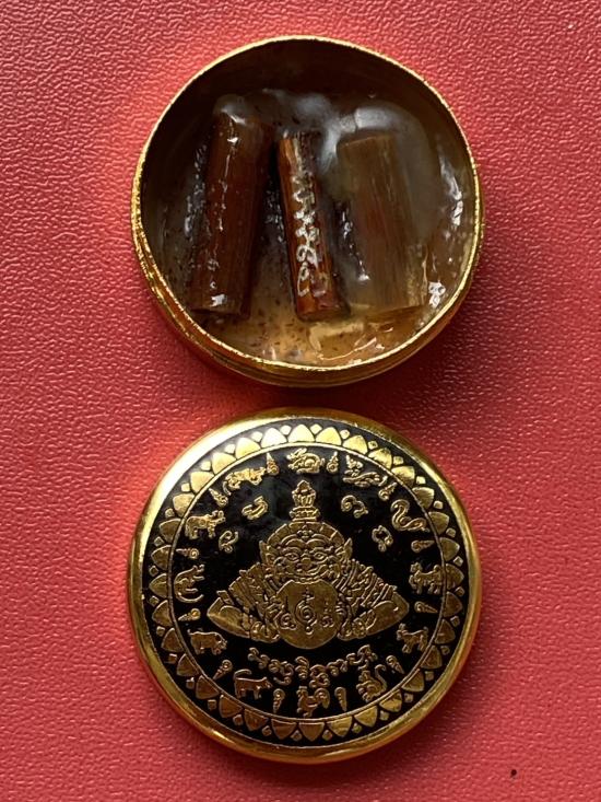 เคาะเดียวแดง สีผึ้งพระราหู รุ่น มงคลจักรวาล เนื้อ โลหะชุบทองลงยาสีดำขอบสีดำ ขนาด 3.2ซม |