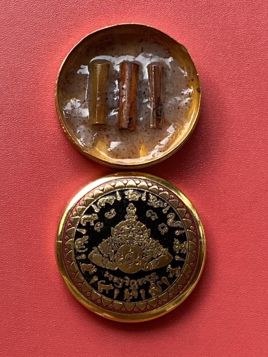 เคาะเดียวแดง สีผึ้งพระราหู รุ่น มงคลจักรวาล เนื้อ โลหะชุบทองลงยาสีดำขอบสีแดง ขนาด 5ซม |